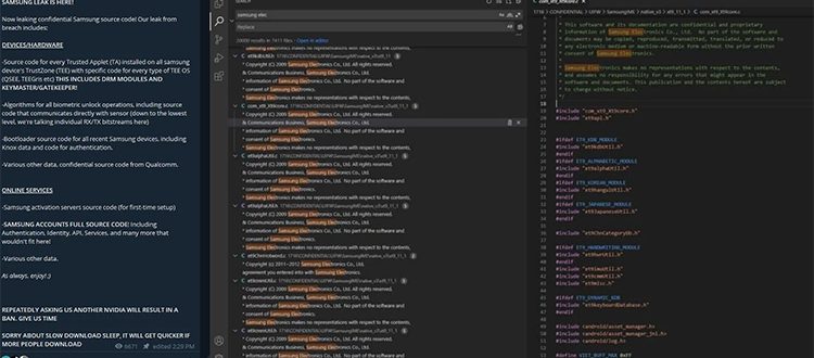 Khối dữ liệu bao gồm bộ nạp khởi động cho các thiết bị gần đây của Samsung đang bị nhóm hacker Lapsus$ phát tán trên Internet. Theo Engadget, tập tin chia sẻ dưới dạng torrent với dung lượng 190 GB. Ngoài mã nguồn bộ nạp, một số dữ liệu khác cũng xuất hiện như xác thực sinh trắc học và mã hóa thiết bị của Samsung. BleepingComputer – trang đầu tiên đưa tin về sự việc còn .