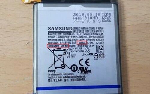 Linh kiện cho thấy Galaxy S11+ có pin dung lượng 5.000 mAh, trong khi Galaxy Note 10+ dùng pin 4.300 mAh. Không chỉ nhiều hơn Note 10+ 700 mAh, dung lượng pin Galaxy S11+ còn bỏ xa các mẫu Galaxy S thế hệ trước. Galaxy S10 và S10+ ra mắt đầu năm nay có pin lần lượt 3.400 mAh và 4.100 mAh. Viên pin 5.000 mAh có in tên mã của Galaxy S11+. Ảnh: GSM .
